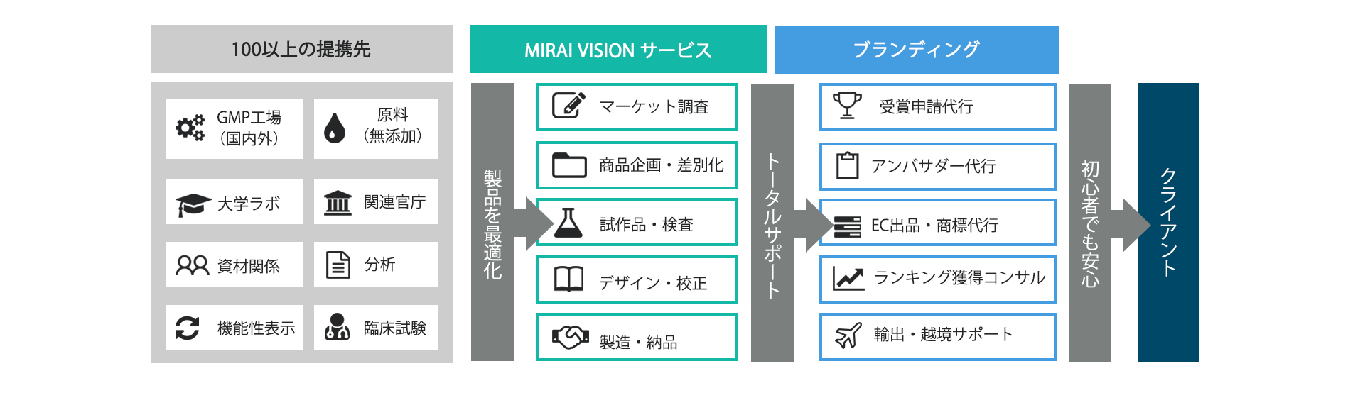 健康食品のOEM/ODM企業として株式会社MIRAI VISIONが、豊富な専門知識と多くの製品化実績をもとにお客様のご要望に合わせ、企画開発から商品設計、商品製造・工場生産まで実現できる最適なプランをご提案します。