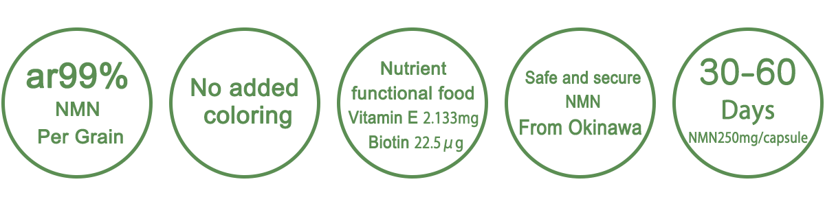 | 영양 성분 표시 2알(0.9g)당 | 에너지・・・3.535kcal 단백질・・・0.375g 지질・・・0.04g 탄수화물・・・0.42g 식염 상당량…0.005g 비타민E・・・2.133mg β-니코틴아미드 모노ㄡ크레오티드(NMN) 500mg |
